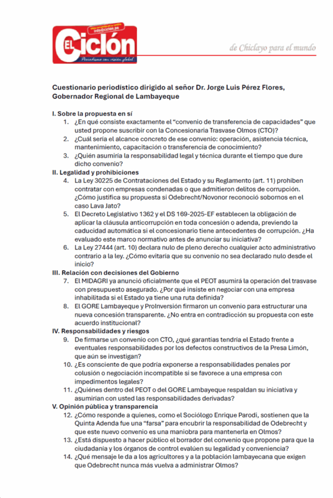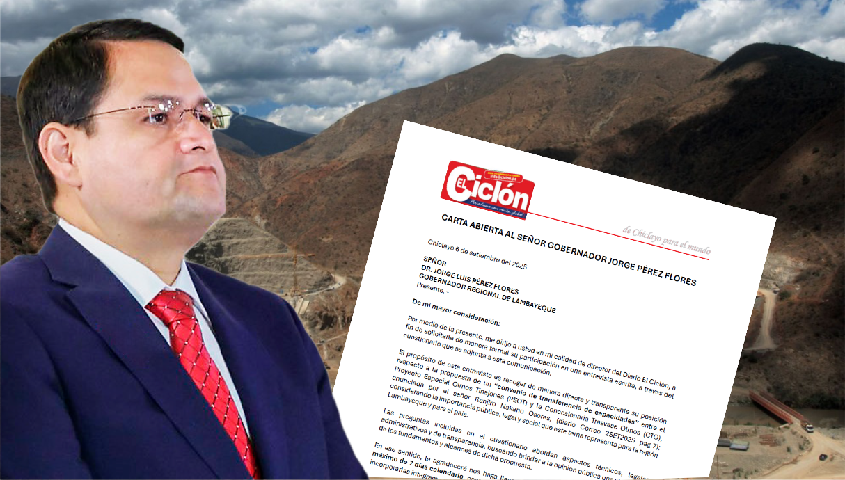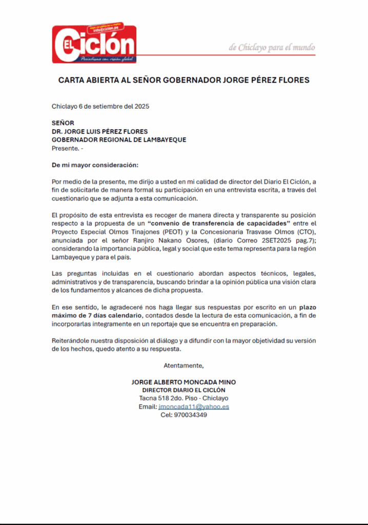 La transparencia no admite evasivas. El diario El Ciclón pone en conocimiento público la Carta abierta dirigida al Gobernador Regional de Lambayeque, Dr. Jorge Luis Pérez Flores, sobre su posición frente a la propuesta de un “convenio de transferencia de capacidades” entre el Proyecto Especial Olmos Tinajones (PEOT) y la Concesionaria Trasvase Olmos (CTO), empresa vinculada al conglomerado Odebrecht/Novonor.