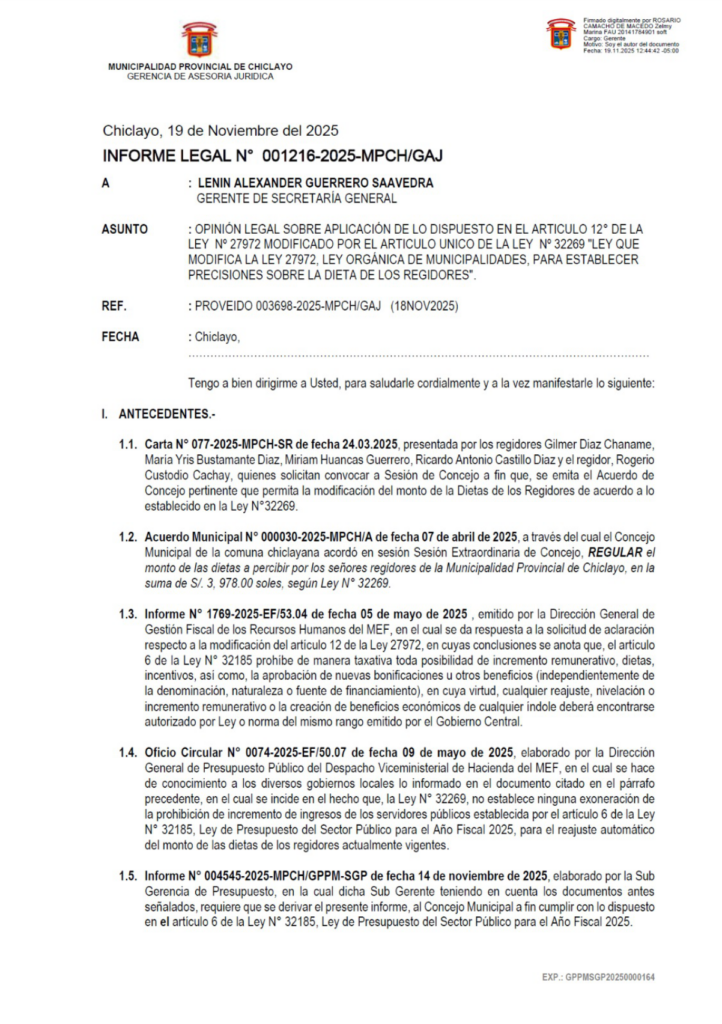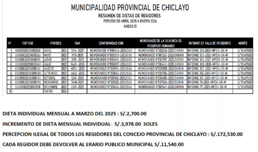 Pese a ello, el 7 de abril de 2025, el Concejo Provincial de Chiclayo aprobó el Acuerdo Municipal N.° 000030-2025-MPCH/A, mediante el cual “regularizó” el monto de las dietas de los regidores en S/ 3,978 mensuales, frente a los S/ 2,700 que percibían hasta diciembre de 2024, monto fijado por el Acuerdo Municipal N.° 006-2023-MPCH/A, de fecha 31 de enero de 2023.
