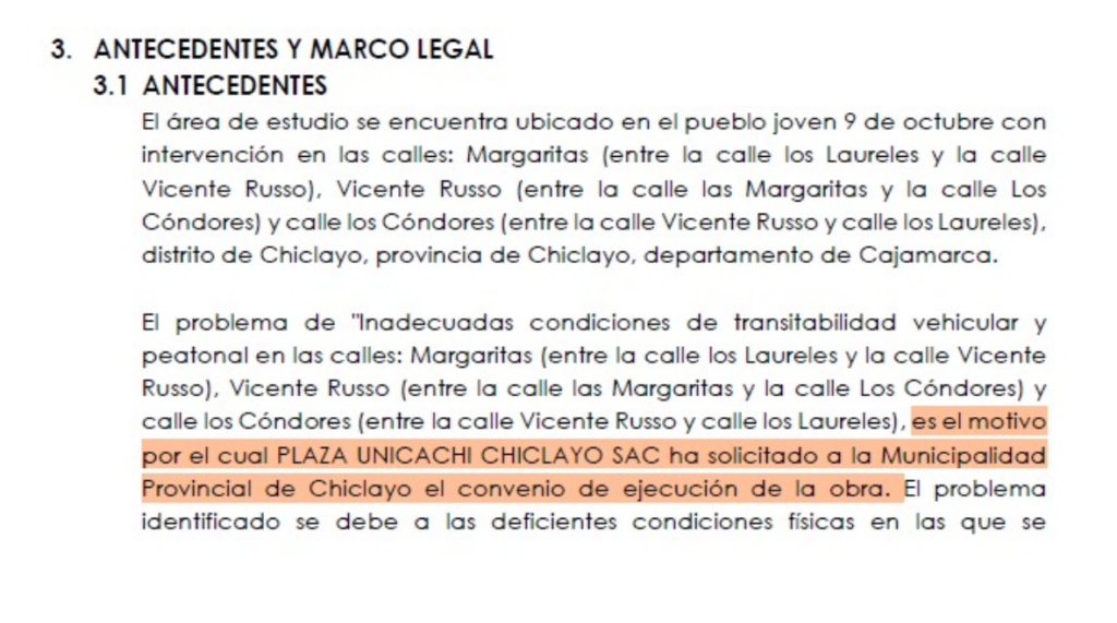 El segundo documento de esta trama es el Estudio de Impacto Ambiental (EIA) de la obra. En su capítulo de antecedentes, el texto introduce un elemento que altera la narrativa administrativa. Allí se lee de forma expresa: “El problema de inadecuadas condiciones de transitabilidad vehicular y peatonal (…) es el motivo por el cual PLAZA UNICACHI CHICLAYO SAC ha solicitado a la Municipalidad Provincial de Chiclayo el convenio de ejecución de la obra”.