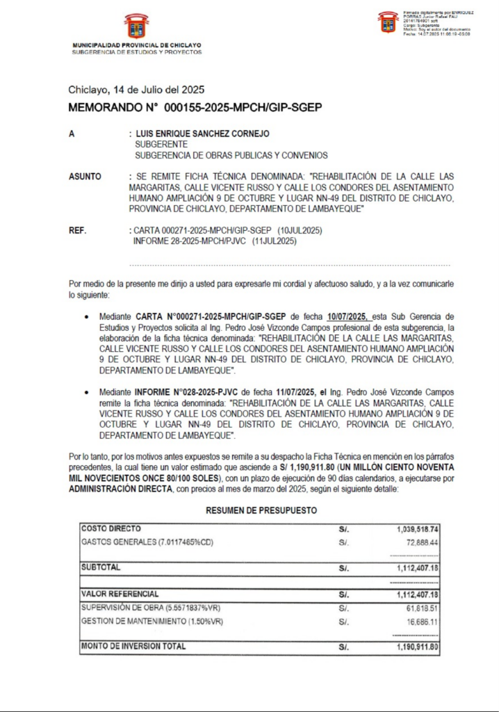 El documento que marca el punto de partida técnico es el Memorando N.° 155-2025-GIP-SGEP, firmado digitalmente por Junior Rafael Enríquez Porras, subgerente de Estudios y Proyectos de la MPCh, dirigido al subgerente de Obras Públicas y Convenios, Luis Enrique Sánchez Cornejo.