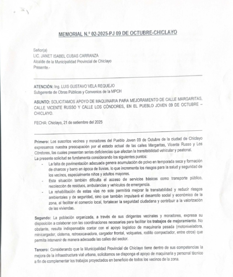 La tercera pieza del rompecabezas es el Memorial N.° 02, fechado el 21 de setiembre de 2025, supuestamente presentado por vecinos del sector solicitando la intervención en las vías. El documento aparece como respaldo social de la obra; no obstante, la cronología abre nuevas dudas.