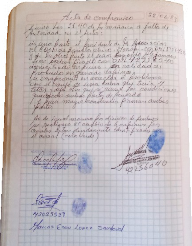 “Don Oscar mire nosotros queremos ayudarle, PROCOMPITE le estaría financiado como parte de un nuevo plan de negocios, la perforación de un pozo en su chacra para que tenga agua y pueda desarrollar mas agricultura, pero lo que queremos es que firme este documento para solucionar los problemas y todo se arregla”