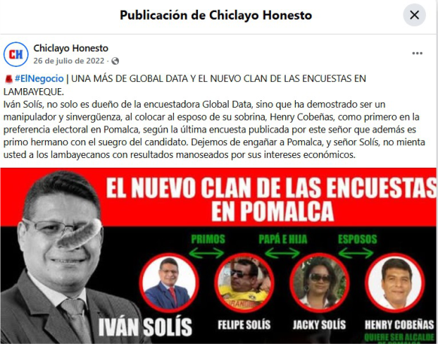 “Iván Solís, no solo es dueño de la encuestadora Global Data, sino que ha demostrado ser un manipulador y sinvergüenza, al colocar al esposo de su sobrina, Henry Cobeñas, como primero en la preferencia electoral en Pomalca, según la última encuesta publicada por este señor que además es primo hermano con el suegro del candidato. Dejemos de engañar a Pomalca, y señor Solís, no mienta usted a los lambayecanos con resultados manoseados por sus intereses económicos”