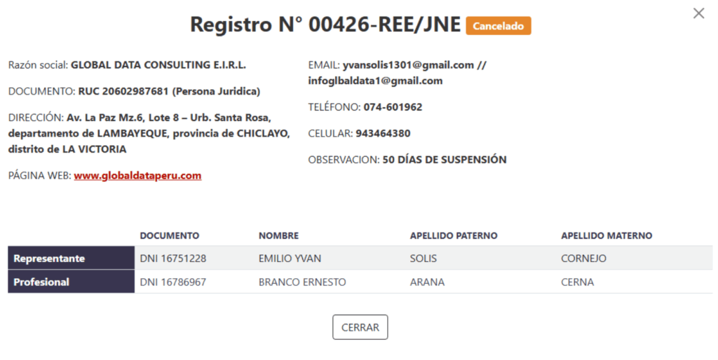 Según la plataforma del REE, en Lambayeque, 18 son las encuestadoras con licencia canceladas: Consultora Vox Populi Eirl, Empresa Peruana de Estudios de Mercado y Opinion publica – Opina Peru Sac; Global Data Consulting Eirl, Tentativa Sac; Tendencia Investigación y Mercado Sac; Estudios de Opinión Publica Datos Perú Eirl; Imágenes y Letras Srl y Consultora Cuantika Sac.