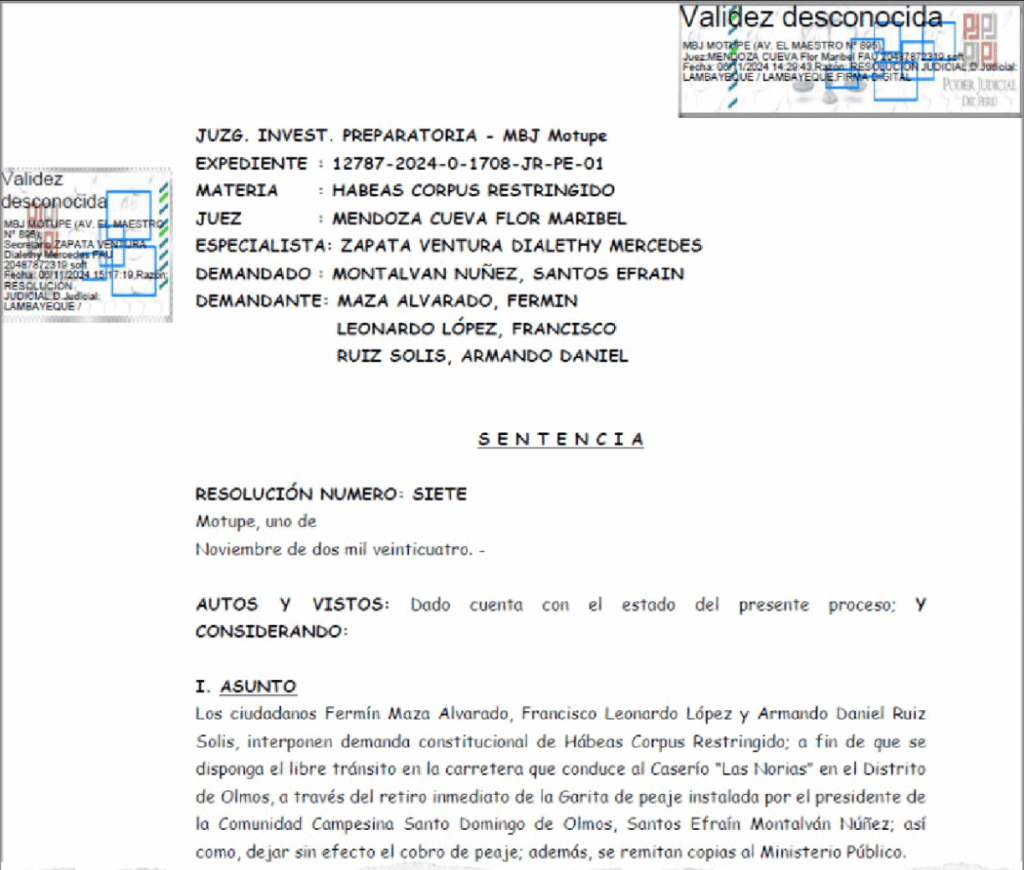 La Comunidad Campesina Santo Domingo de Olmos (CCSDO), reconocida como persona jurídica bajo el amparo del artículo 89 de la Constitución, obtuvo respaldo judicial en noviembre de 2024, cuando el Juzgado de Investigación Preparatoria de Motupe, mediante Sentencia N.º 7 (Exp. 12787-2024), declaró infundada la demanda de hábeas corpus interpuesta por transportistas que reclamaban el retiro del peaje comunal.