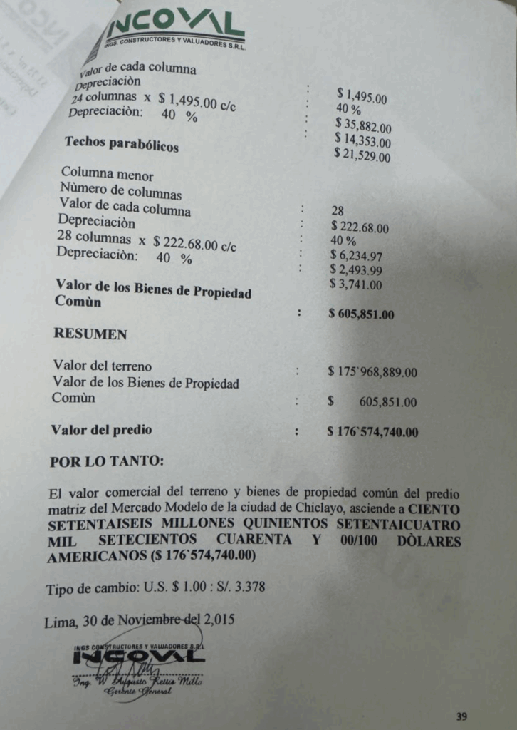 En 2015, la Junta de Propietarios contrató a la empresa INCOVAL para que realice la tasación estableciendo el valor comercial del terreno y bienes de propiedad común en USD$ 176’574,740, al cambio actual sonS/618’011,000. Esta cifra —muy superior a lo que el municipio podía imaginar— sigue siendo un fantasma que recorre el debate público: ¿cómo financiar semejante indemnización?