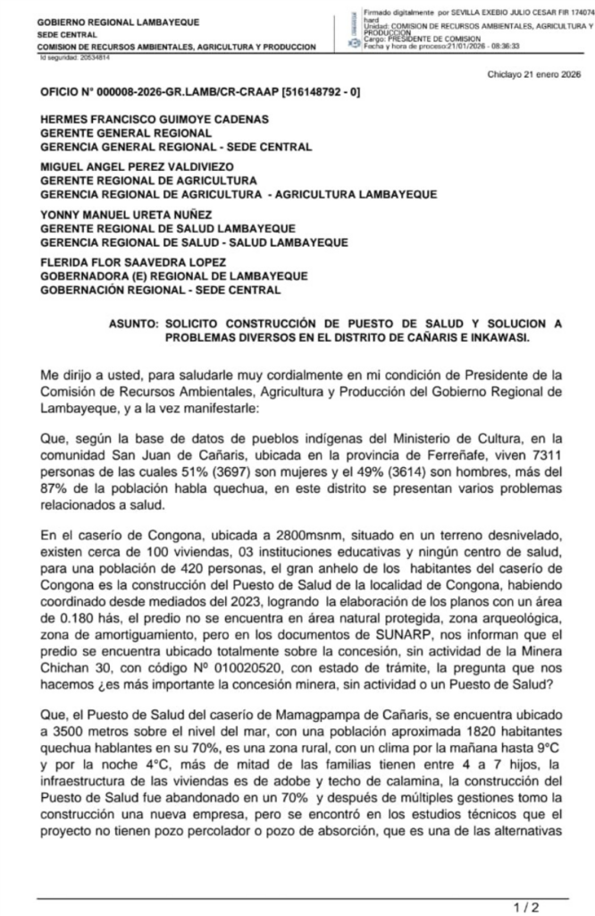 El 21 de enero de 2026, el consejero regional Julio César Sevilla Exebio soltó una bomba informativa que debería hacer rodar cabezas en el Ministerio de Energía y Minas. A través del Oficio N° 000008-2026-GR.LAMB/CR-CRAAP, se desnudó la perversión del sistema, en el caserío de Congona, donde 420 seres humanos claman por un puesto de salud, el Estado les ha respondido que no pueden tenerlo porque el suelo que pisan está “concesionado”.