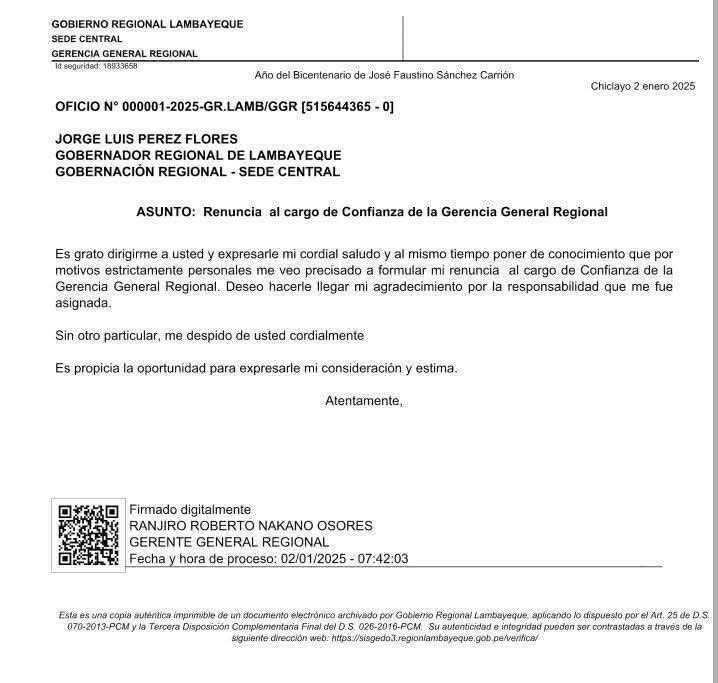 El memorando Nº 000006-2026-GR LAMB/GR, fechado el 7 de enero de 2026 y firmado por el gobernador regional de Lambayeque, Jorge Luis Pérez Flores, es contundente.
