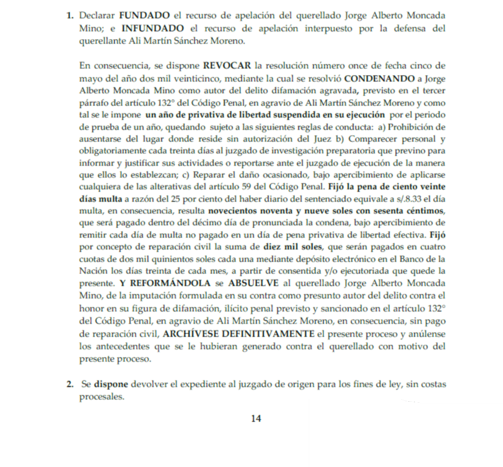 absolvió al periodista Jorge Alberto Moncada Mino, director del portal Centinela Digital, (y de esta casa editorial), quien había sido condenado en primera instancia por el delito de difamación agravada a raíz de una denuncia interpuesta por Ali Martín Sánchez Moreno, director de la UGEL Chiclayo.