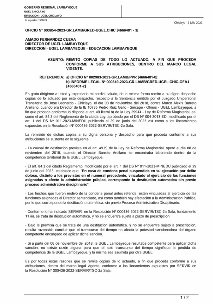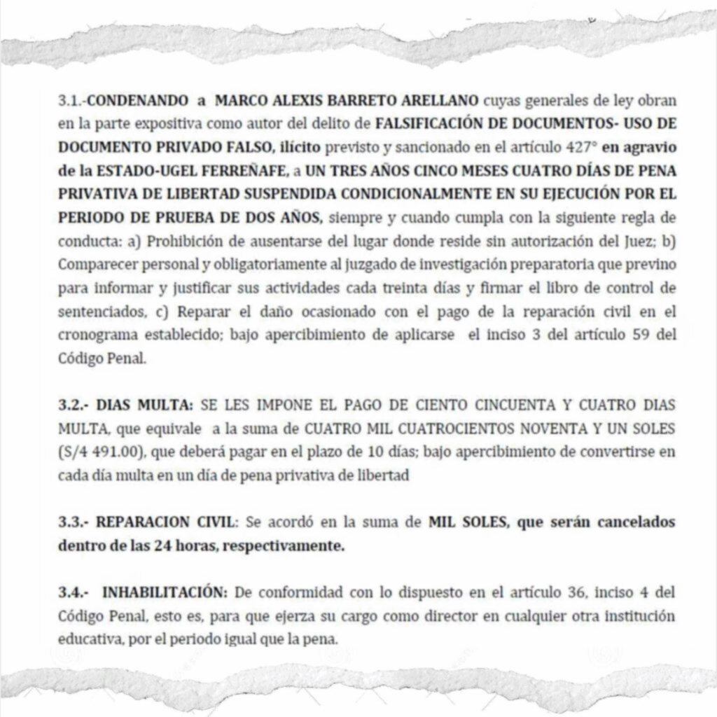 El caso expuesto por Centinela Digital se originó cuando el docente Marco Alexis Barreto Arellano, pese a estar condenado e inhabilitado judicialmente (Exp. N°046-2012-19), fue reasignado como director del histórico Colegio Nacional San José de Chiclayo.